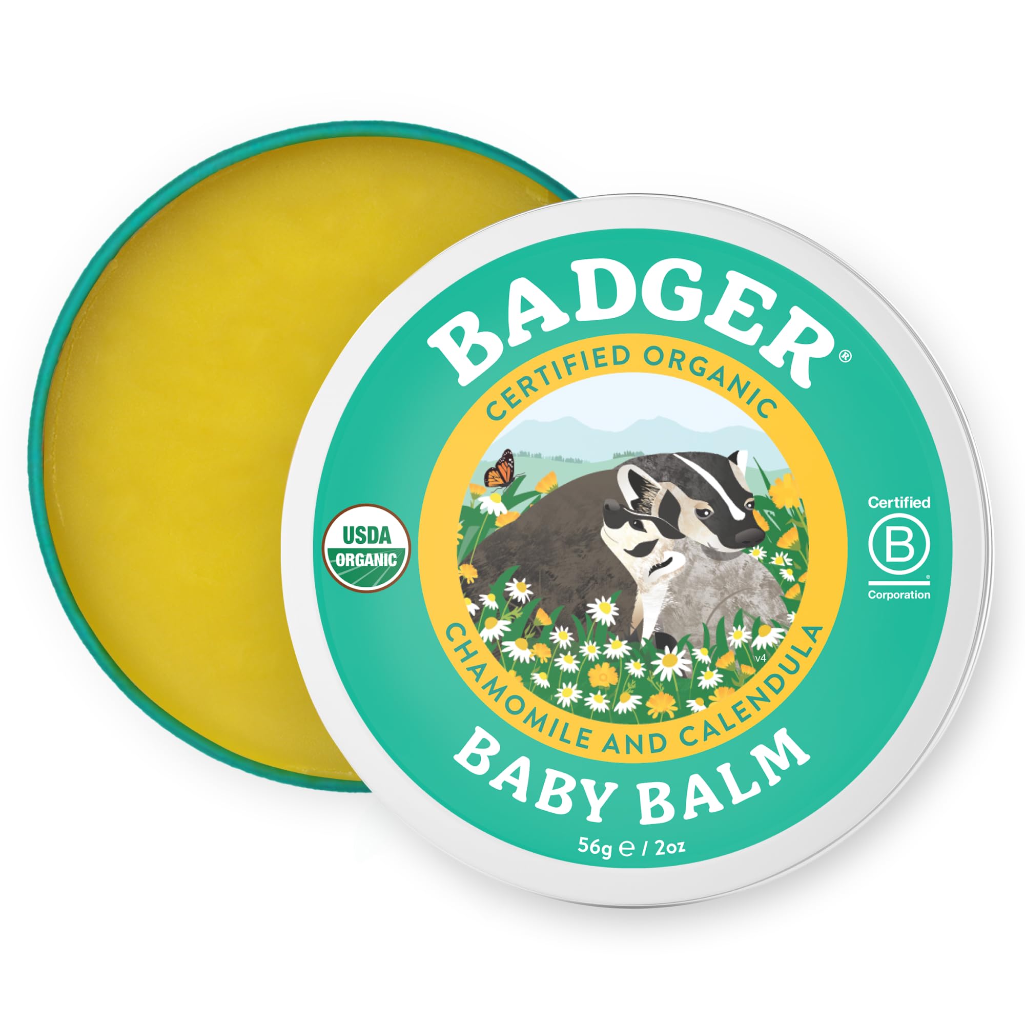 Badger Baby Balm Chamomile is a 2 oz all-natural, organic skincare essential designed to protect and soothe delicate baby skin. Featuring a blend of organic beeswax, castor oil, olive oil, and calming chamomile and calendula, it locks in moisture while relieving diaper rash, eczema, and dry patches. Made sustainably in the USA by a women-owned family business, this cruelty-free, gluten-free balm is a versatile, eco-conscious choice for modern parents seeking gentle, effective baby care.