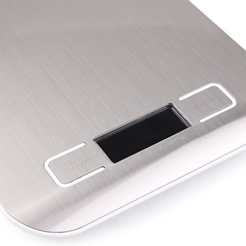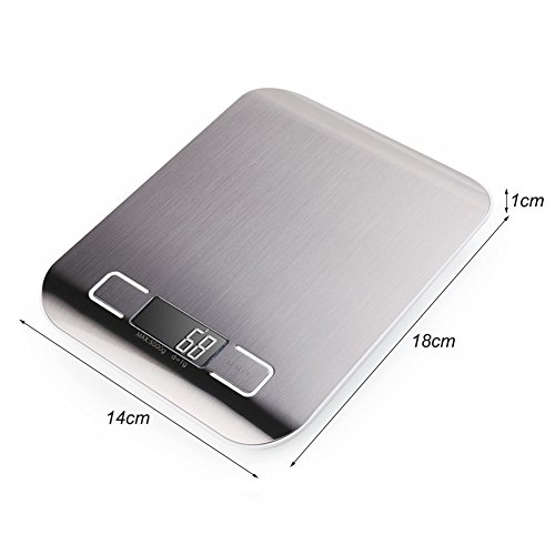 Simply to Use, the Best Scales in Your Kitchen! No matter dry ingredients or liquids, simply switch Electronic Food Scale on and it will show you the weight of things immediately! Specifications: Material: Stainless steel wire drawing + ABS Product Size):180mm(7.1in) * 10mm(0.4in) * 140mm(5.5in) High-definition LCD display size:40mm(1.6in) *18(1.6in)mm Automatic shut off Time: approximately 60s Maximum range:5000g Minimum indexing:1g Weight unit::g/ml/oz/lb.oz Features: ★ They feature high quality sensors that give accurate measurements all the time. ★There is a crystal clear LCD display that will let you see the results clearly every time. Steps: 1. Turn on the scale. 2. Place a tray or container on the scale platform. 3. Only"0.00" displays it can be loaded weighed. 4. Add items to the container or tray. 5. Press the UNIT key to convert the unit. 6. Long press the on/off key, you can shutdown. Note: ● Please put a bowl on the scales or cover the scales with a plastic wrap before weighing wet ingredients. ● Clean the scale with a slightly damp cloth, DO NOT immerse the scale in water or use chemical/abrasive cleaning agents. ● Please do not put over-weighed items on the platform.If the prompt indicates that the current loading weight has exceeded the maximum range of the product, please remove the object in time to avoid damage. QUALITY GUARANTEE: Quality is a top priority at art of beauty. If there's any reason you're not 100% SATISFIED, let us know and you will get a full refund or replacement and friendly customer service. Package: 1 * Digital scales 1 * Colourful package 1 * User manual