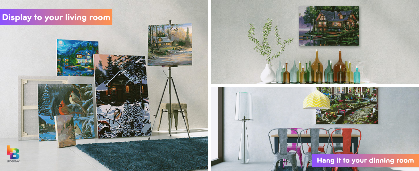 Ledgebay Paint by Number kit offers a 16" x 20" premium cotton canvas featuring licensed artwork, delivered in protective rolled packaging. The vacuum-sealed acrylic paints and wooden-handle brushes ensure durability and freshness, making it an all-inclusive, beginner-friendly creative experience.