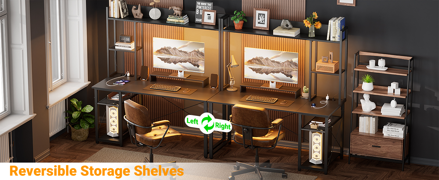 【Computer Desk with Reversible 5-Tier Storage Shelves】This computer desk features 5-tier storage shelves. You can place your CPU, PS4, plants, files and so on. The shelves can be installed on the left/right side depending on your needs. And the shelf is adjustable you can adjust it as you like.
