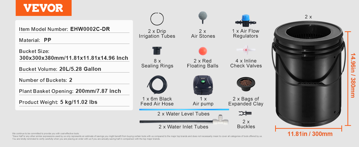 The VEVORDWC Hydroponics Grow System is a comprehensive 5-gallon deep water culture kit designed for optimal plant growth. Featuring durable, corrosion-proof materials and a user-friendly design, this system includes everything you need for successful hydroponic gardening, from a powerful air pump to a precise top drip irrigation system.