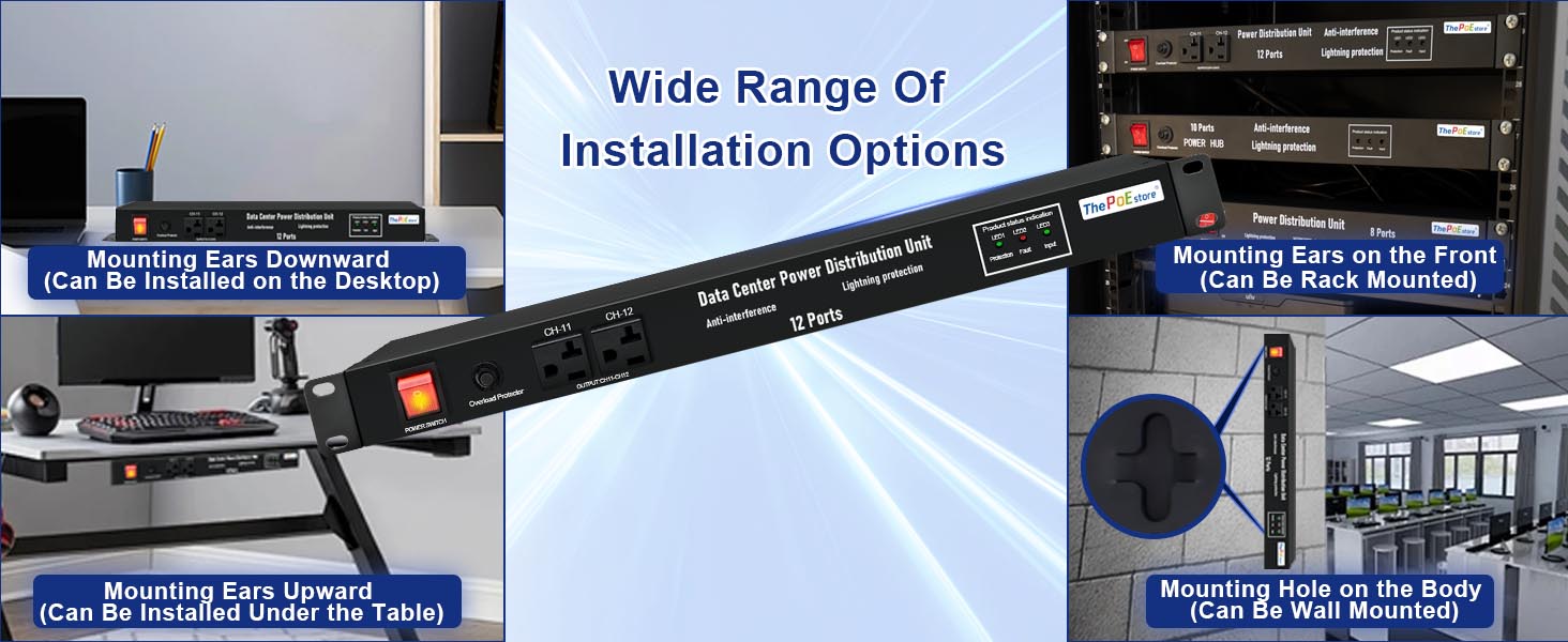 ThePoEstore’s 1U PDU Network Surge Protector is a 19-inch rackmount power strip featuring 12 outlets, 3600 joules surge protection, and a heavy-duty 16 ft 12AWG cord. ETL certified and designed with anti-interference circuitry, it offers versatile mounting options and reliable power distribution for network servers, AV, and IT equipment.
