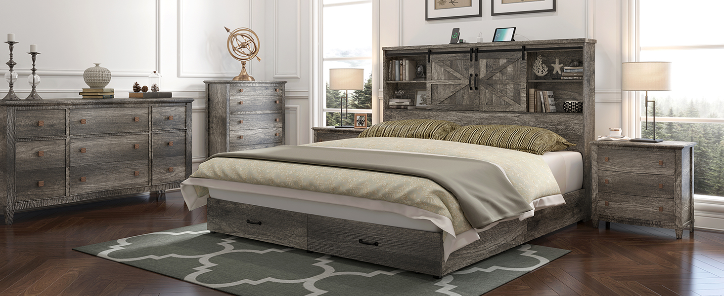 The HOWE King Size Wood Platform Bed Frame combines rustic farmhouse aesthetics with modern convenience, featuring a 51.2" bookshelf headboard with sliding barn door, abundant storage including 2 rolling drawers, and a built-in USB charging station. Its solid metal frame with 12 support legs and noise-dampening design eliminates the need for a box spring, ensuring a stable and silent sleep experience. Easy to assemble with included hardware and backed by responsive customer support.