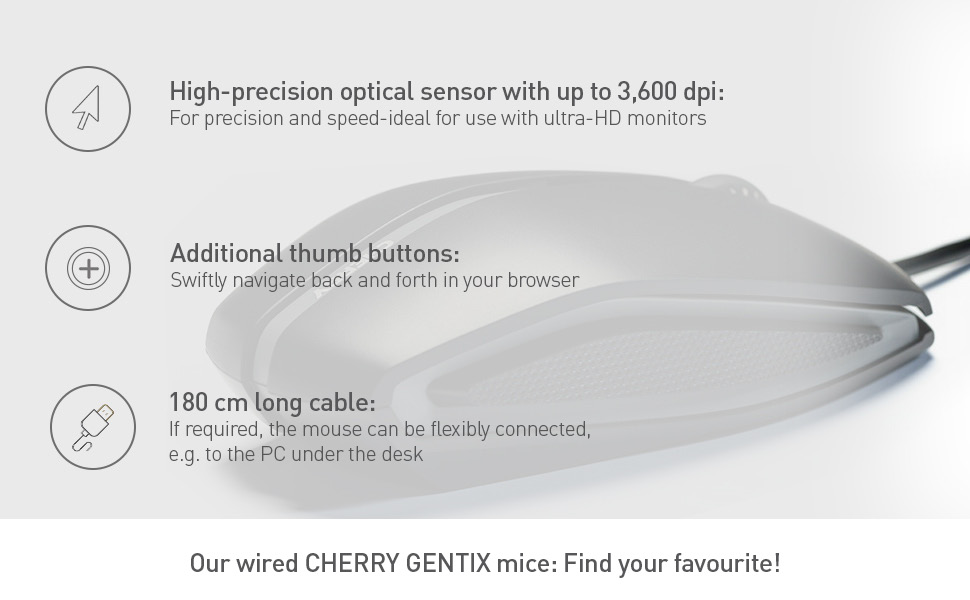 The CHERRY GENTIX 4K wired mouse is engineered for professionals demanding ultra-HD clarity and precision. Featuring a high-precision optical sensor with adjustable DPI up to 3600, a symmetrical ambidextrous design with rubberized grips, and a 1.8-meter cable for flexible setup, it delivers comfort and control for both left- and right-handed users. The red illuminated scroll wheel provides real-time DPI feedback, making it an ideal companion for 4K monitor users seeking seamless productivity.