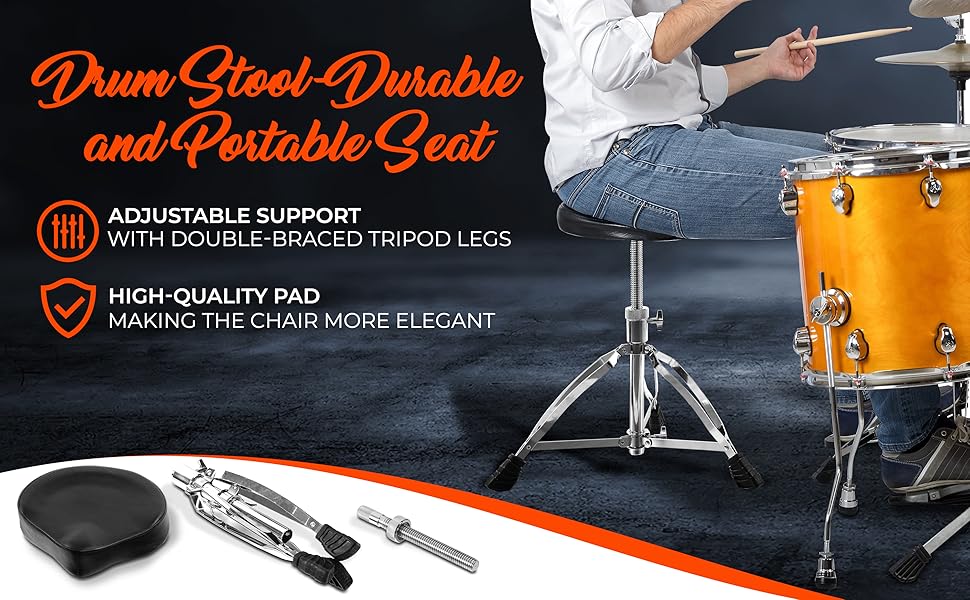 The Pyle Pro Throne Adjustable Drum Stool features a height-adjustable design with secure bolt lock and knob, double-braced steel tripod legs for enhanced stability, and a reversible foam-cushioned seat for superior comfort. Equipped with non-slip rubber feet, it’s built for both stage and studio use, catering to drummers of all skill levels with portability and durability.