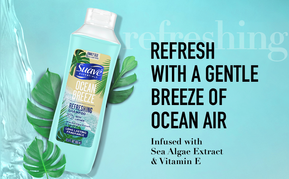 Suave Essentials Refreshing Shampoo, Infused with Sea Algae Extract and Vitamin E, Ocean Breeze Hair Shampoo with a Long Lasting Fragrance 22.5 oz
