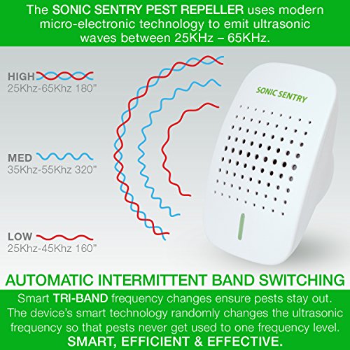 BESPIN HOME SONIC SENTRY ADOPTING MODERN MICRO-ELECTRONIC TECHNOLOGY, the Sonic Sentry Ultrasonic Pest Repeller unit emits special ultrasonic waves between 25KHz - 65KHz. THROUGH THE UNIQUE ULTRASONIC SPEAKER, the unit acts upon the hearing and the nervous system of pests such as mice and rats to make them feel unpleasant and uncomfortable. ASSISTS IN DETERRING OTHER PESTS SUCH AS INSECTS including spiders, cockroaches, ants, flies, mosquitoes, flies etc. Please note that the main function of the device is to deter rodents, deterring other types of pests is an additional benefit. LETHAL & CHEMICAL FREE along with being completely harmless to humans. THE DEVICE INTERMITTENTLY CHANGES THE FREQUENCY of the ultrasonic sound waves, so that the pests cannot become accustomed to any one particular frequency level. The frequency changes are indicated by the changing colour of the LED light display. No.1 Ultrasonic Wave: 25Khz-45KHz 160" working - LED Red No.2 Ultrasonic Wave: 35KHz-55KHz 320" working - LED Blue No.3 Ultrasonic Wave: 45KHz-65KHz 180" working - LED Red & Blue Please note: It is normal to hear some murmuring or slight clicking from the device during operation. This is due to the intermittent band wave switching. Unit Specifications: • Repels and removes mice, rats & other pests using ultrasonic waves • Safe & effective to use • Child & pet friendly • Intermittent ultrasonic band switching • Frequency: 25KHz-65KHz • 150 square meter coverage • Unique test function • LED night light • CE, RoHS & FCC certified • Fireproof materials Flame Retardant Grade UL-94V-0 • External ceramic fuse 1A-BS1362 • Power Voltage: 100 - 240 V AC, 50/60Hz • Power consumption less than 3WWHAT's IN THE BOX:X1 Sonic Sentry Ultrasonic Pest RepellerX1 Colour Instruction Manual