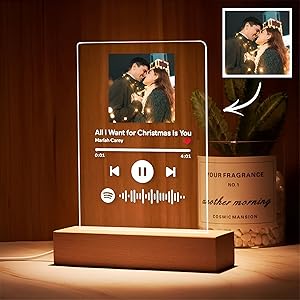 The SHAYONA Personalized Spotify Photo Frame is a medium-sized, eco-friendly acrylic and wood music plaque featuring a custom scannable Spotify code. It illuminates with warm white LED light, offering a stylish, cordless tabletop display that plays your favorite song instantly. Perfect as a modern, heartfelt gift for music lovers, it combines durable craftsmanship with personalized digital interaction.