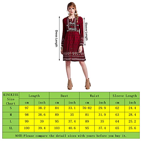 Bohoartist Pullover Red Floral Lace up Long Sleeve Single-Breasted Flower Print Day Short Dress Size Description: (unit: inch) Bust S:33.9 M:35.8 L:38.2 XL:40.6 Waist S:29.9 M:31.9 L:35.0 XL:37.4 Sleeve Length S:24.4 M:24.8 L:25.2 XL:25.6 Dress Length S:38.2 M:38.6 L:39.0 XL:39.4 Notes:*Please note there are four Sizes (S,M,L,XL) available for your choice .Compare the size chart with yours before buy it, and please allow 1-3cm difference due to different measurement methods may. *Wash recommended: 30 degrees water temperature, please avoid alkaline washing supplies, reverse washing, should not be forced to stretch, to avoid high temperature ironing.