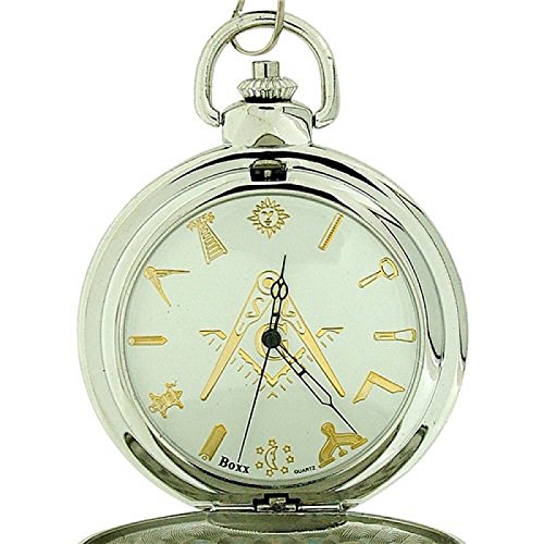 A solid and sturdy pocket watch by Boxx, this is a high functioning timepiece which will serve you well for home, business and leisure wear.This pocket watch is an ideal gift for him. Product Features: * Quartz movement. * White dial with masonic symbols. * Hour, minute and second hand. * Sunray silver tone case with contrasting gold tone masonic design. Also Comes With: * Presentation Box. * Manufacturers Guarantee.