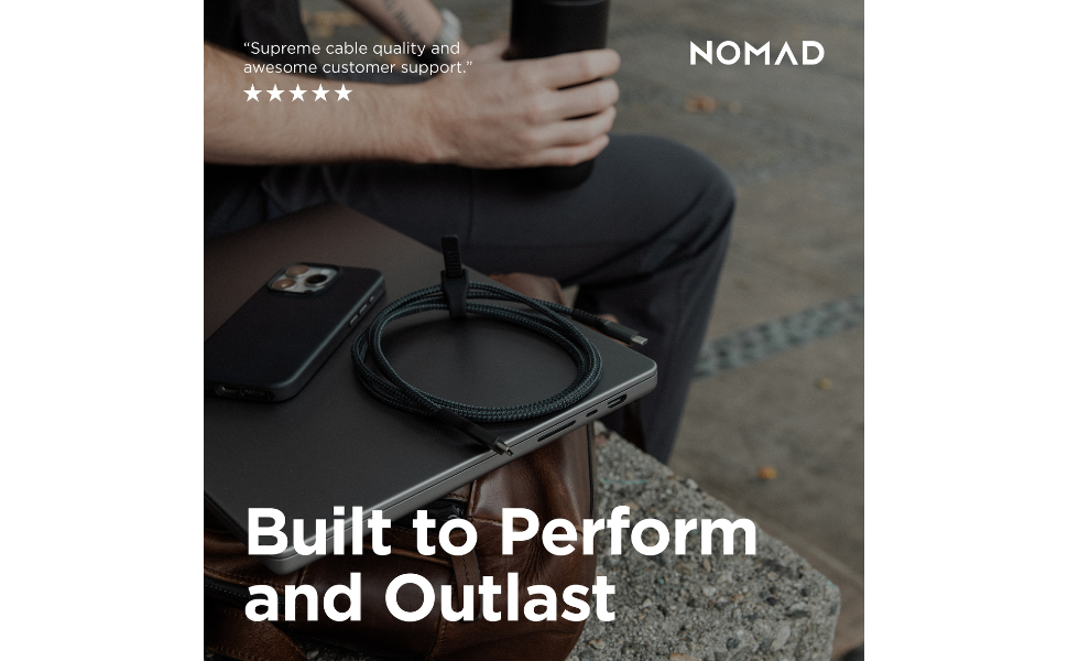 The NOMAD USB-C Cable 1.5M is a high-performance charging solution featuring a Kevlar outer braid for exceptional strength and durability. With 100W Power Delivery, it ensures rapid charging for all USB-C devices, while its metal alloy connectors provide long-lasting reliability. The integrated cable tie keeps your setup organized, making it perfect for both travel and everyday use.