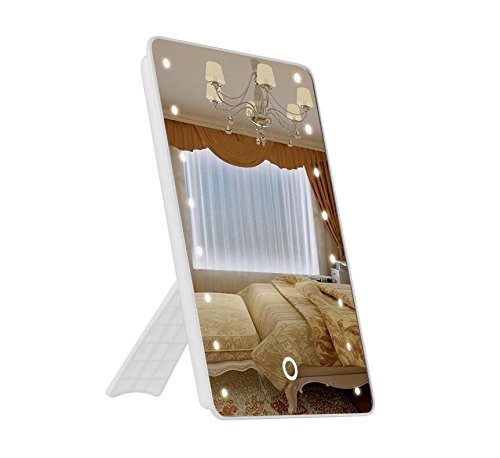 Features:Smart Touch Button: Long press the touch button to adjust the brightness freely, turn on/off the lightLow power consumption: powered by 4 x AA batteries (Not included), low power consumped so that the 16 LED can work continuously for super long, no frequent battery replacementCordless design makes movable application possible, anywhere just go 16 LED circled to provide you clean and bright scene for your easier lifeCollapsible kickstand in the mirror back, thus desired angle ensured, and easy carrying doable for sure in the meantimeHow to Operate:1. Move the switch in the mirror back to the "ON" position firstly2. Touch the smart button in the bottom of face side, and light on3. Press and hold the smart button to increase the brightness, and long press again to dim the light4. Press the smart button again to turn light off5. When not in use, move the button in mirror back to "OFF" position, then standby power consumption can be savedSpecification:Powered by: 4 x AA batteries(Not included)LED: 16leds (white light)Material: ABSSize(Length x Width x Thickness): 25.6 x 18.6 x 2.3cmPackage Includes:1 x Mirror Light1 x English Manual