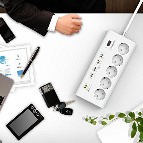 Description:* consolidate your output comes with 5?& 5?USB ports, a multifunction Power Socket.* Quick charge 3.0?(QC 3.0) technology, not just the charging speed is 4?times allowing you to bring your subject into focus two times conventional (your device up to 80% in 35?minutes), but also can be adjusted to the power of the Heat Loss Effectively.* Can be used in different occasions, ideal for multi devices at home or in the office solution.* Attached to & off switch you can quickly and securely control the power supply with a single button.* It protects your equipment from to high energy consumption Protect, overheating and overcharging.* Good Anti jamming, quick charge output.* Fire PC shell, 100% copper wire that is anti oxidation and overload protection.* All around protection: advanced built in security the most complete protection may vary from tension, voltage spike, fire, knocks and rust and prevents dents and scratches.* 4?universal USB port, 1?x USB Fast Charger (almost full power), you can charge mobile phones, Pads Or Other Small Electronic Devices at the same time. Box Contents:1?x Power outlet strip, 1xBedienungsanleitung Keep the net away from children, fire, heat, water, moisture.Avoid to beat and fall the plug extension cable.