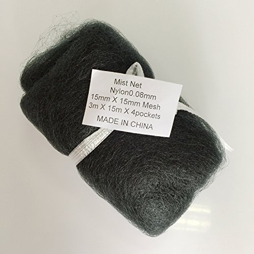 3x15m 15mmx15mm mesh size Bird Mist net Bird Capture net Bird Catching Net 0.08mm SUNSHORE bird mist netting is mainly for preventing small birds, such as sparrow and thrush, etc, and will not hurt the birds. Mist nets are used by ornithologists and bat biologists to capture wild birds and bats for banding or other research projects. It is a quick, easy and economical method of capturing birds, bats and more. Mist net is lightweight and easy to use. Specification: Product Name : Bird Mist Net Mesh; Material : Nylon. Color:Black; Pockets: 4 pockets. Each pack nylon netting 15m Length x 3m height. Easy to install,simple use. Wire thickness 0.08mm. Package : 1 x bird net