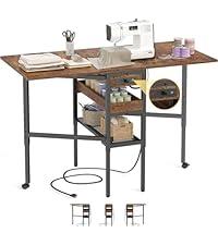 The Besiost Folding Sewing Cutting Table is a modern, height-adjustable craft station featuring a 50" foldable tabletop with built-in charging ports (2 AC, 2 USB). Designed for small spaces, it folds down to 12" wide and includes dual storage shelves plus lockable casters for stability and mobility. Perfect for sewing, cutting, or multi-purpose crafting, it combines durability with ergonomic comfort to elevate your creative workflow.